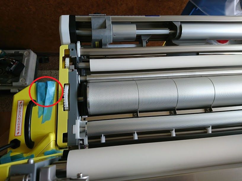 赤丸のところは自動回転ボタンなんですがここにも必ず養生してます。糊のついた手で触ってばかりいて以前このボタンが押した状態になったまま戻らななくなって直すのにひどく苦労しました。