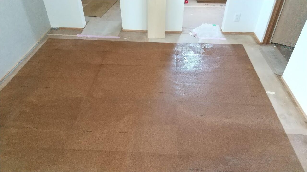 最初に床とコルクと速乾両面塗布。失敗が許されませんね。貼り付けたら動きません。